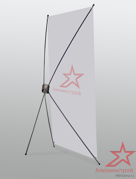 Стенд Х-баннер является разновидностью баннерных стендов натяжного типа и является недорогой альтернативой стенду Roll up. У Х-баннера отсутствует плоская основа, а вертикальное положение ему обеспечивают две перекрещивающихся опоры из углепластика. Мобильный стенд за счет легкости транспортировки и сборки (сборка занимает 20-30 секунд и не требует никаких специальных навыков) наиболее популярен при проведении выставок и семинаров, оповещения о рекламных акциях и скидках.