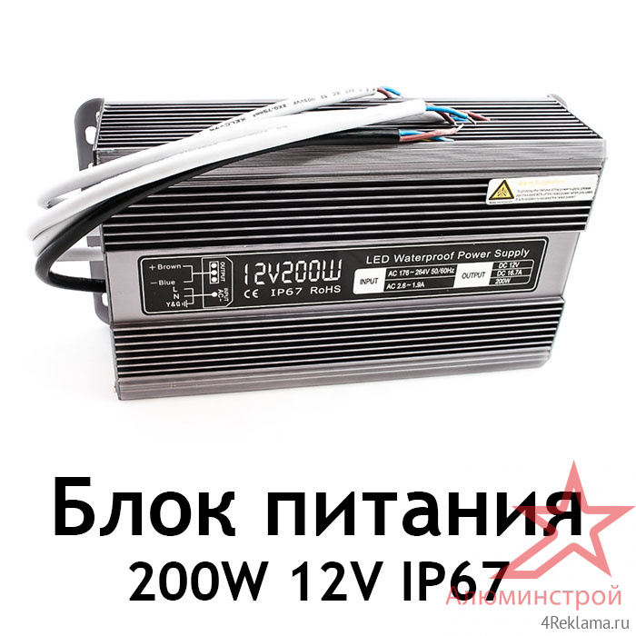 Блок питания герметичный пылевлагозащищенный IP67 для светодиодных лент и модулей. Блок представляет собой преобразователь напряжения с 220V на 12V, с допустимой мощностью нагрузки 200 Ватт. Электронная система имеет защиту от скачков напряжения и перегрузки. Корпус блока питания выполнен из металла, представляет собой герметичный корпус с элементами уплотнения. Блок питания IP67 полностью защищен от попадания пыли, влаги и струй воды под любым углом и предназначен для работы в составе рекламной конструкции, установленной как на улице, так и внутри в помещения.